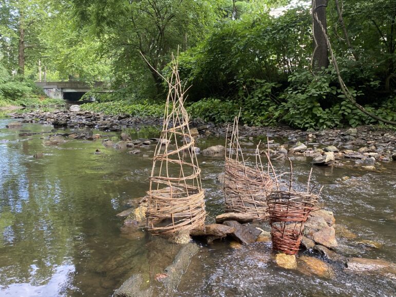 Rebecca Schultz’ sculptures are inspired by the forms and materials utilized by Indigenous peoples to build traditional fish traps, along with Hester-Dandy substrate samplers, a tool used to collect macroinvertebrate samples from freshwater. Schultz’ compelling take on these forms are exhibited in Tookany Creek, in High School Park, Elkins Park, PA. A World in Our Streams combines creative artworks and conservation science to explore the dynamic habitat of aquatic macroinvertebrates.