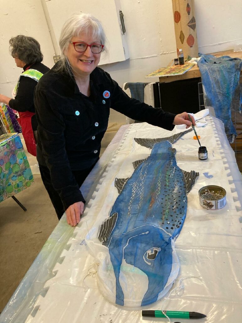 Endangered Species Coalition volunteers gathered at a Seattle garage this past Saturday to help paint more of our world famous silk Chinook Salmon wind socks. These wind socks have appeared throughout the Pacific Northwest at rallies, marches, and booths to represent the endangered Chinook Salmon of the Snake River that have been devastated over the past fifty years by four dams on the Lower Snake River in southeast Washington. These wild fish, once numbering over 150,000 return over 800 miles up rivers and to streams as high as 7,000 feet elevation,have fallen to less than 10,000 fish returning a year.
